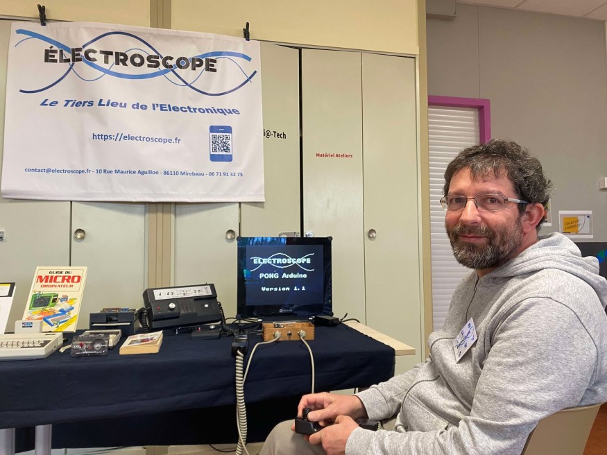 Électroscope, c’est un tiers-lieu qui souhaite mettre au point une exposition sur l’électronique, de ses origines à nos jours, mais aussi sur la sensibilisation à l’électronique, sur le plan humain, psychologique et écologique. Electroscope est basé dans la Vienne à Mirebeau, mais Fabrice intervient beaucoup dans les Deux-Sèvres pour y parler de sa passion de l’électronique. « L’idée, c’est de transmettre des valeurs et l’histoire de l’électronique qui a beaucoup évolué en très peu de temps. J’ai la chance de vivre cette évolution, et de la vivre au quotidien parce que c’est mon métier. Je souhaite transmettre mon savoir et toute cette histoire pour que ça ne se perde pas ». L’homme a, au fil du temps, glané beaucoup d’objets pour remplir les expositions qu’il fait dans des événements. Fabrice intervient régulièrement dans les Deux-Sèvres pour y proposer ses mini-expositions, où l’on retrouve tout un tas d’objets curieux. Dans le cas de l’exposition au Centre de ressources Média Tech de Saint Loup, il avait installé un jeu vidéo pong qu’il a lui-même créé.