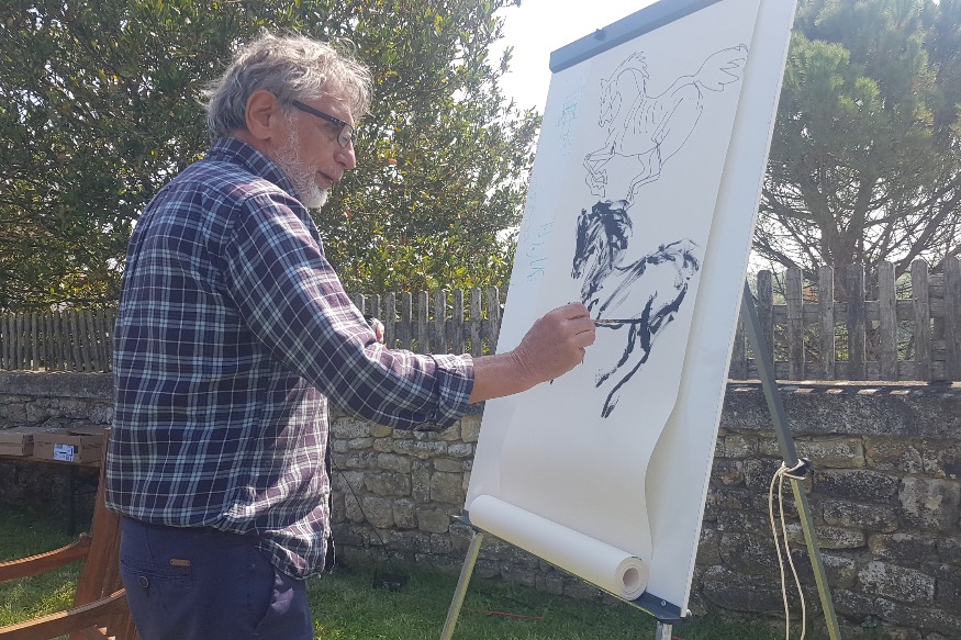 Ces mots, ils ont été prononcés par l’auteur de bande dessinée Edmond Baudoin. Samedi matin, il était l’invité du marché d’Ardin pour un temps d’échange avec le public et pour signer quelques dédicaces. Pendant deux bonnes heures, celui qui vient juste de fêter ses 80 printemps, a conquis son auditoire en traçant un trait, ou plutôt des traits, avec son crayon et son pinceau, entre le dessin et la musique. Avec toujours en toile de fond, l’humanité, qui n’est pas un vain mot en 2022. Rencontre.