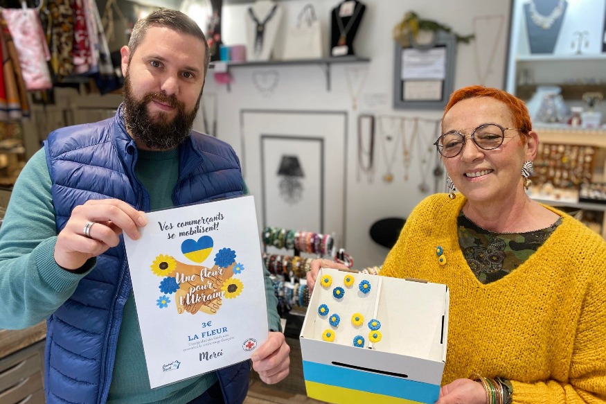 Les commerçants de Parthenay ont décidé de se mobiliser pour l'Ukraine, qui subit depuis plus d'un mois les foudres des bombardements de la Russie. Pour cela ils viennent de lancer l'opération "Une fleur pour l'Ukraine". Une broche en forme de fleur et aux couleurs de l'Ukraine, proposée à la vente dans les commerces participants au prix de 3€. Ce bijoux fait main, a été réalisée par Nathalie Raillot, gérante de la boutique Bijoutez-vous, rue Jean-Jaurès. La créatrice nous présente cette opération.