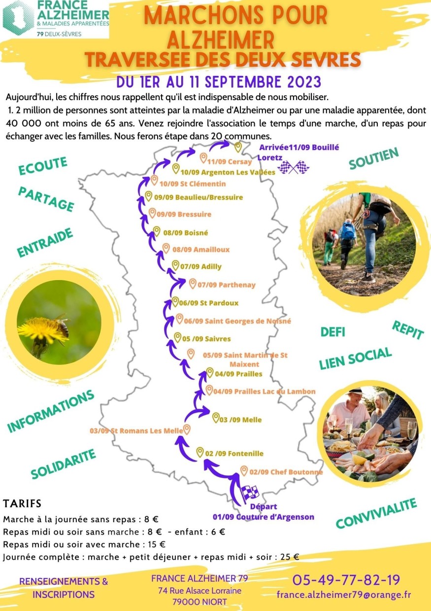 En 2018, France Alzheimer avait organisé un tour des Deux-Sèvres à pied. Les 777 marcheurs avaient parcouru un peu plus de 500 kilomètres, sillonnant tout le département. Cette année, c’est une traversée des Deux-Sèvres qui est au programme. Avec le même objectif. Allez à la rencontre des gens atteints de cette maladie, mais pas que, l’idée, c’est aussi d’informer en s’arrêtant dans plusieurs communes. Avec ce nouvel itinéraire, France Alzheimer souhaite toucher un maximum de personnes. Jacques Poussard, président de France Alzheimer 79, nous donne plus de détails sur cet évenement.