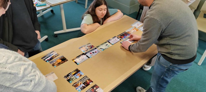 Une douzaine de participants se sont divisés en deux groupes. Chaque groupe se réunit autour d'une table. Les animatrices, Elodie Robbe et Béatrice Barbot, leur distribue six cartes, d'abord. "Activités humaines", "effet de serre additionnel", "énergies fossiles" : chacune désigne un phénomène. En discutant, les participants doivent agencer ces cartes sur la table dans leur logique. Et ça suscite des questions.