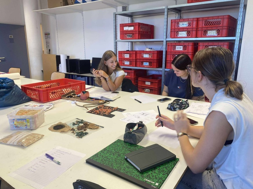 Exemple avec Léane, Solène et Camille, qui travaillent ensemble sur les copeaux de bois. « Les copeaux, c'est fin, irrégulier, aléatoire, c’est une matière quand même assez facile à manipuler sur lesquelles on a pu faire beaucoup d’expérimentations » expliquent-elles. Au final, elles ont décidé d’en faire une urne funéraire. « C’est une urne qui se décompose dans la nature, ça permet aux personnes qui ont un proche incinéré de la garder, ou de la planter où ils le souhaitent. On trouve qu’il n’y a pas assez de choses pour les défunts dans le design, on avait envie d’en faire quelque chose ».