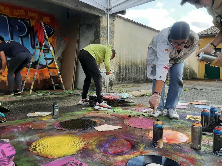 On fignole les pochoirs sur les vinyles d’occasion et chacun signe son nom sur la pancarte "Campus" pour décorer le lieu. L’artiste-peintre spécialisé dans les pochoirs, les graffs et les arts de la rue bien connu localement, Arti, donne des conseils aux jeunes : "Mets ta bombe bien droite. Ouais, voilà, t’as le bon rythme." L'artiste est un habitué des ateliers avec les enfants. Ça lui permet de compléter son salaire puisque "c’est très compliqué de vivre du graffiti", remarque-t-il. Il travaille avec les jeunes aussi parce que ça résonne avec son métier d'avant et parce qu'il "aime passer des messages. Cet atelier, c’est le bon exemple parce que là, ils ont appris ce qu’était Emmaüs.", précise Arti.